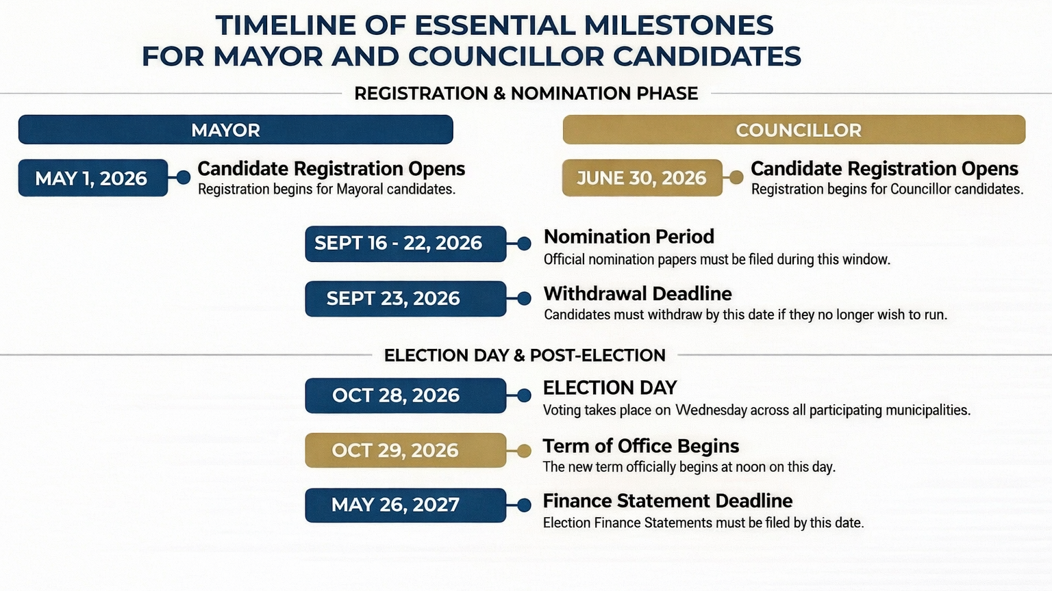 - June 30, 2026 – September 20, 2026: Deadline for Candidate Registration For the office of Councillor