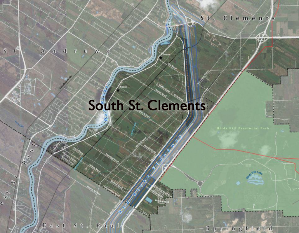 - South St. Clements has an area of about 29 square kilometres and it is bounded by the Red River to the west, Lockport to the north, East St. Paul to the south and the floodway to the west with a small portion east of the floodway.