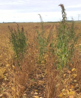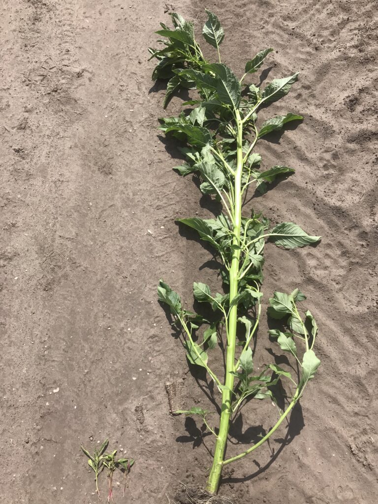 While this weed was a feature weed last year, the fact that in 2019, five municipalities in Manitoba have had new detections of waterhemp made it a feature weed again this year. The native habitat of waterhemp is wet, low-lying areas, but it is quite at home in reduced tillage and no-till environments. Watch for patches to pop up along field edges or near the field entrance. Waterhemp has very tiny seed, (similar to red root pigweed seed), so it is easily transported in equipment, with water and by wildlife. Removing small patches of waterhemp prior to seed set, and destroying the plants, is one of the most effective strategies to eradicate this weed (Picture 2).